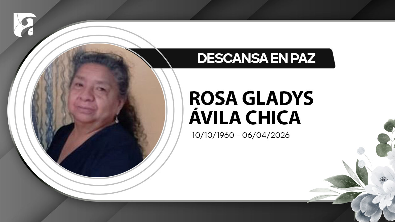 Ha fallecido la señora Rosa Gladys Ávila Chica. Su esposo, Jorge Maldonado; sus hijos, Liliana y Daniel Maldonado; su hijo político; sus nietas, Daniela y Sofía; sus hermanos, sobrinos y demás familiares comunican tan lamentable pérdida e invitan a la velación de sus restos mortales, que se cumplirá en la sala de velaciones del Sindicato de Choferes Profesionales del cantón Girón.