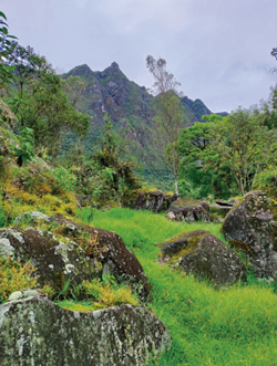 Primer plano, parte del ‘Bosque de Piedra” donde se encuentra “La Cueva del Brujo. Al fondo se erige el majestuoso cerro Quillotuñi.