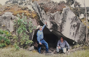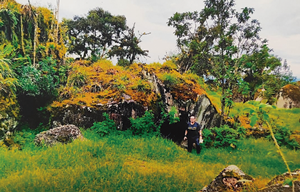 Abrigo bajo roca y su entorno, dentro del “Bosque de Piedra”, en donde se observa la entrada a la “Cueva del Brujo”, comunidad Pueblo Viejo, parroquia La Asunción, cantón Girón.
