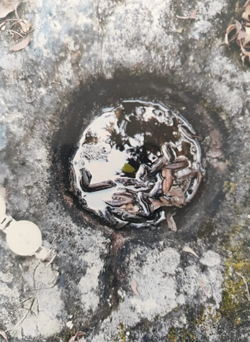 A más de un centenar de metros hacia el noreste de la que denominamos “La cueva del brujo” donde se encuentran los petroglifos. En medio de un campo de pasto, se encuentra aislado un bloque grande de piedra andesita poliédrica de 2,00×1,60×0,70 metros de largo, ancho y espesor, respectivamente. En una cara irregular de superficie naturalmente pulida se observa en la parte superior una espiral simple, con un apéndice lineal recto y otra espiral de menor tamaño; en la sección inferior muestra un grabado rectangular incompleto en uno de sus lados, con once líneas paralelas oblicuas, semejantes a flecos de un chal.